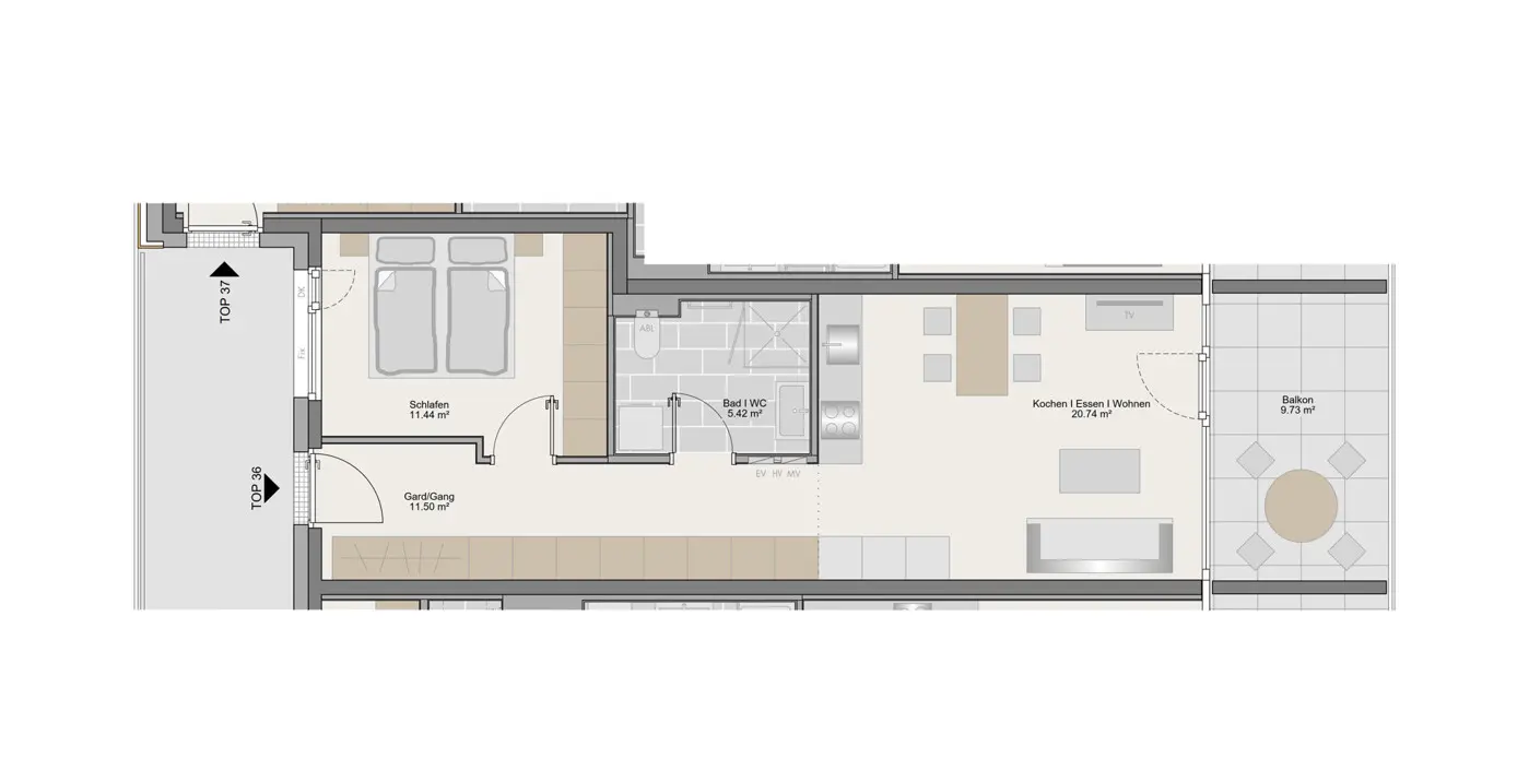 Ideal für Singles, Paare oder als wertbeständige Kapitalanlage. Diese ca. 49 m² großen 2-Zimmer-Wohnungen beweisen, dass wahre Wohnqualität keine Frage der Quadratmeter, sondern der Planung ist. Mit einer eigener Terrasse kannst du entspannte Abende an der frischen Luft und mit Blick in die Berge oder ins Grüne genießen.